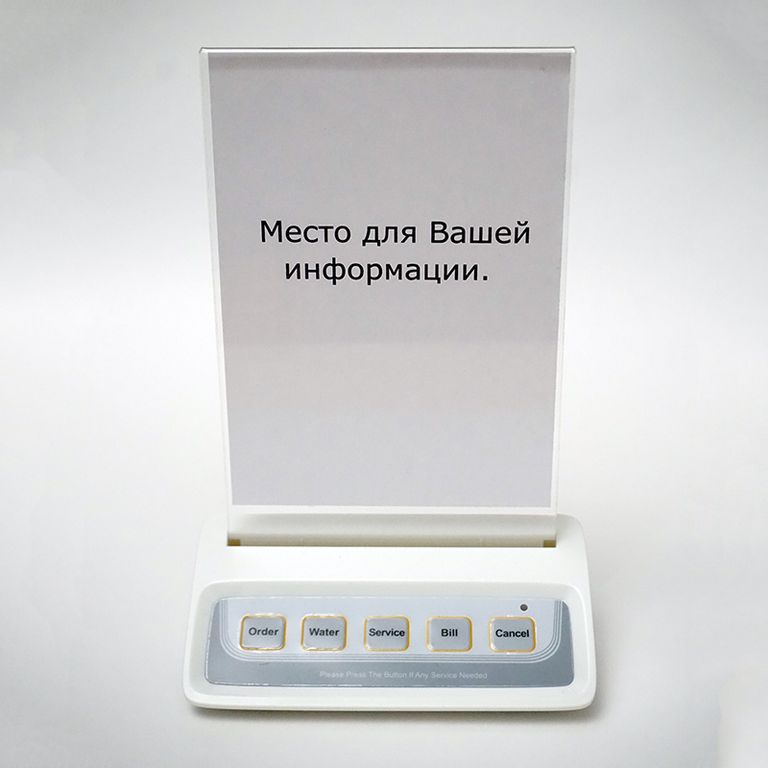 Побуждает сделать заказ. Ознакомившись с размещенной в подставке формата А6 информацией об акции или блюде дня, клиент имеет возможность сделать заказ в одно нажатие на кнопку. Простая установка. Не требуется установка. Кнопка оснащена прорезининными ножками. Всепогодность. Кнопка защищена от влаги и пыли. Вы можете установить ее на летней веранде, не опасаясь за ее работоспособность. |